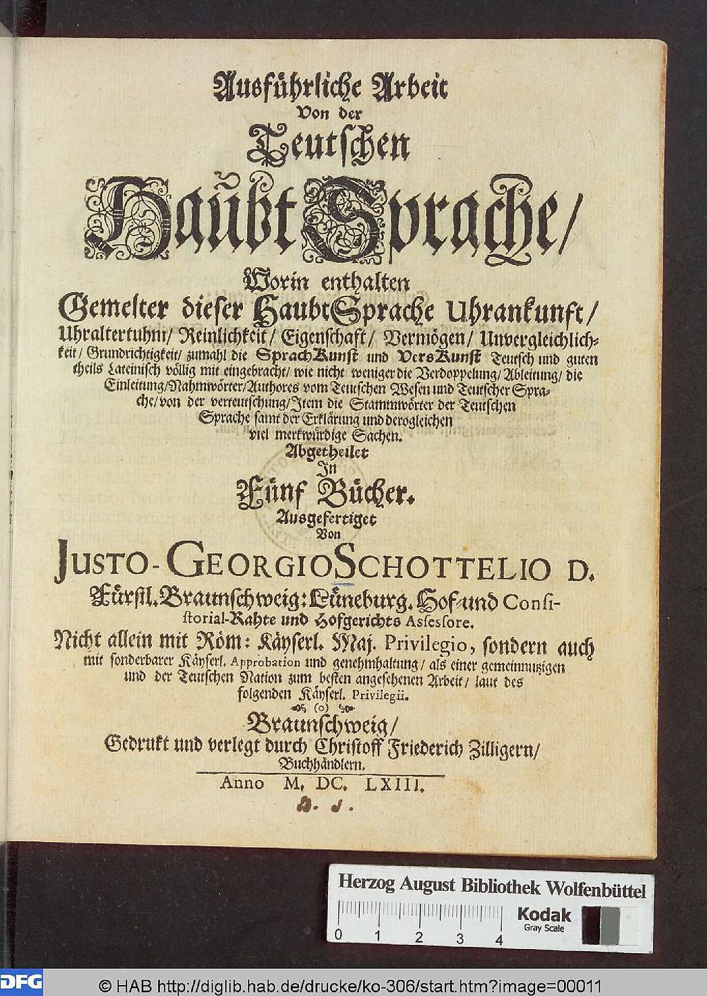 - Schottelius, Justus Georg: Ausführliche Arbeit Von der Teutschen HaubtSprache, Braunschweig: Zilliger 1663