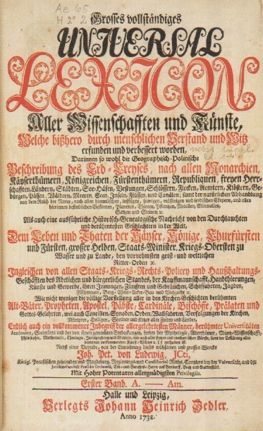 1731–1754 – Johann Heinrich Zedler, Grosses vollständiges Universal-Lexicon Aller Wissenschafften und Künste