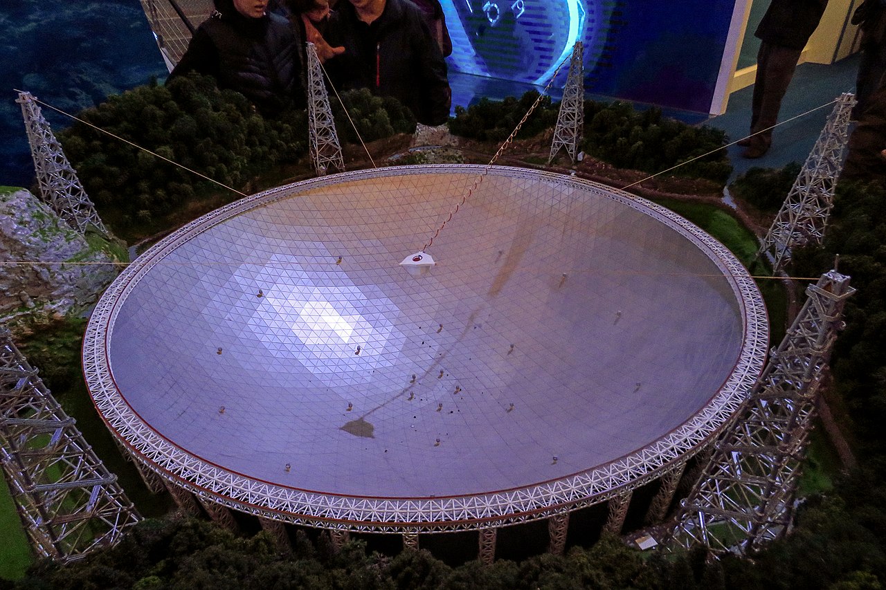 Das Radioteleskop „FAST“ (Five-hundred-meter Aperture Spherical Telescope) mit dem chinesischen Spitznamen „Tianyan“ (übers.: „Himmelsauge“) in der Provinz Guizhou im Südwesten Chinas ist das weltweit größte Radioteleskop mit einer gefüllten Apertur und nach dem RATAN-600 das zweitgrößte Radioteleskop mit einer einzigen Schüssel. Am 25. September 2016 wird das 180 Mio. US-Dollar teure Projekt nach fünfjähriger Bauzeit in Betrieb genommen. Die reflektierende Fläche der geodätischen Kuppel mit einem Durchmesser von 500 m besteht aus 4450 dreieckigen Aluminiumpaneelen mit einer Seitenlänge von 11 m, befindet sich in einer natürlichen Senke und bündelt die Radiowellen auf eine Empfangsantenne in einer 140 m darüber hängenden Kabine. Unter den Paneelen befinden sich 2225 Winden, welche die Oberfläche zu einer beweglichen Parabolantenne werden lassen, die auf die gewünschte Himmelsrichtung ausgerichtet werden kann. Dieser Aufbau erlaubt ohne die Verwendung eines Schwenkmechanismus’ Beobachtungen von Himmelsregionen bis 40° Zenitdistanz. Das Radioteleskop ermöglicht astronomische Entdeckungen, insbesondere die Erforschung von Pulsaren profitiert seither mit über 500 neu registrierten Objekten. – Kaim Bozkurt