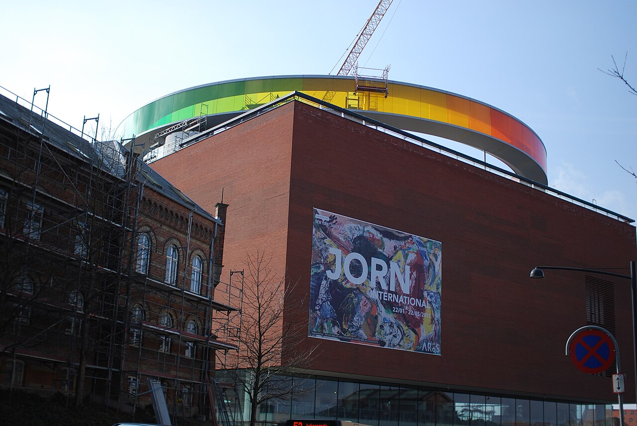 Auf einem Dach des Kunstmuseums ARoS im dänischen Aarhus installierter, begehbarer Rundring von 150 m Umfang mit panoramatischen Aussichts-Glaswänden, die so getönt sind, dass sie sich zu einem ‚Regenbogen-Farbkreis‘ schließen. – Lea Müller | Johannes Ullmaier