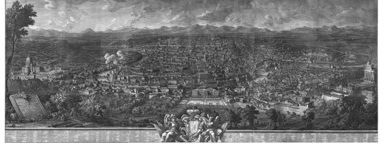Der Radierer Vasi bietet Touristen in Rom eine majestätische Ansicht der Stadt mitsamt Legende an, die aus zwölf großen Blättern zusammengesetzt ist. Sie zeigt in horizontaler Erstreckung detailliert Gebäude und Straßenzüge, wobei der Aufnahmewinkel schon ungefähr einen Halbkreis beschreibt. Den unteren Abschluss der Ansicht bildet eine fingierte Balustrade mit dem Vers des Dichters Martial „HINC SEPTEM DOMINOS VIDERE MONTES/ET TOTAM LICET AESTIMARE ROMAM“, zu Deutsch: „von hier aus erblickt man die sieben herrschaftlichen Hügel und kann den Anblick von ganz Rom genießen“. Das Werk verbindet die Tradition des Stadtplans in der Vogelschau mit der Panorama-Vedute. Von der Produktion von Veduten lässt sich eine Verbindung bis zu den großen Panoramarundbildern des 19. Jahrhunderts ziehen, die häufig ebenfalls den Rundblick über eine Stadt von einem erhöhten Standpunkt aus simulieren. – Clara Wörsdörfer